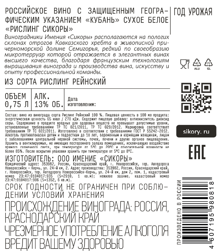 Вино Сикоры Рислинг белое сухое, 0.75л