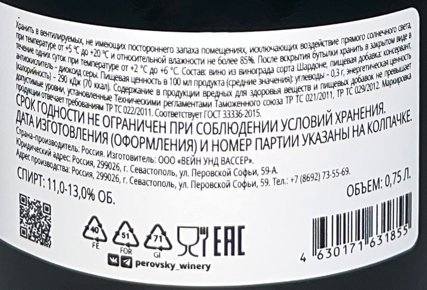 Вино из сорта винограда Шардоне, антиокислитель - диоксид серы.