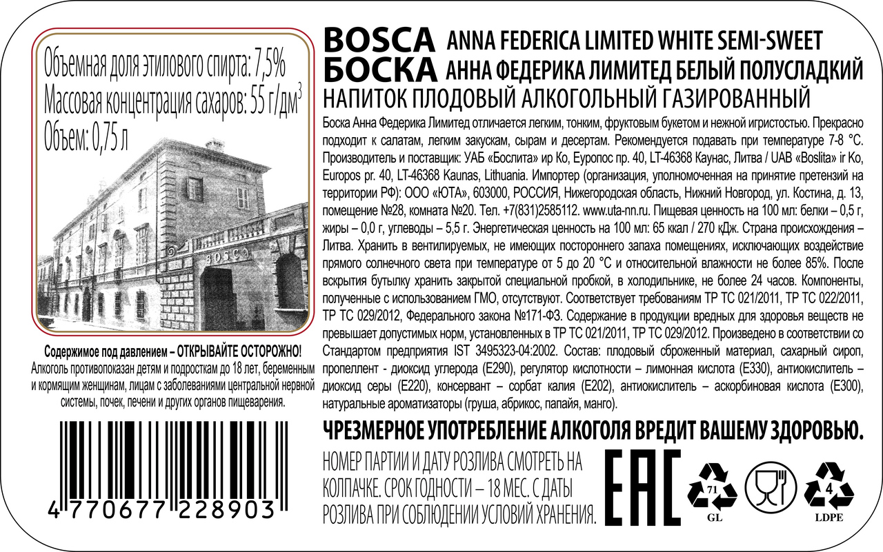 Напиток плодовый Bosca Anna Federica Limited белое полусладкое, 0.75л отличается насыщенным, освежающим вкусом с легкой кислинкой и нотками фруктов – яблока, персика, цитрусовых, приятным ароматом с нюансами лепестков розы. Послевкусие длительное. Напиток рекомендуется употреблять охлажденным. Для этого бутылку с содержимым нужно поместить в специальное ведро, расположенное на отдельном столе, заполненное прохладной водой и кусочками льда. Температура сервировки должна составлять 6-8C. Плодовый напиток может выступать в качестве аперитива. Он идеально сочетается с ягодами, фруктами, мясом, птицей, овощами. Хорошо дополняет ризотто, отбивные, пирожные, пасту, пиццу и многое другое. Отличной закуской могут стать красная икра, канапе, сырные нарезки. Напиток принято наливать в вытянутый бокал на длинной ножке на две трети. При этом бутылку следует держать на расстоянии 8-10 см от края фужера. Напиток поставляется в элегантной бутылке с яркой этикеткой, которая будет эффектно смотреться как на обеденном, так и на праздничном столе. Она станет хорошим дополнением к основному подарку для родных и близких. Bosca – это итальянский бренд, под которым производятся различные игристые вина. Он является частью компании Bosca SpA, которая появилась в 1831 году. Основателем является Пьер Боска. На сегодняшний день широкий ассортимент включает в себя восемь видов игристого вина, которые экспортируются в страны Балтии, Украину, Польшу, Великобританию и т.д.