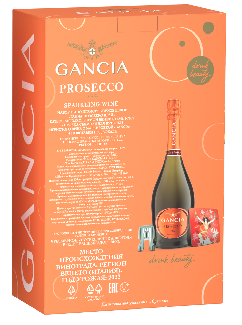 Вино игристое Gancia Prosecco в подарочной упаковке белое сухое + стопер, 0.75л - известное итальянское сухое игристое вино, которое изготавливается из винограда сорта Глера (Просекко) по традиционному рецепту методом Шарма-Маринотти. Вино имеет неповторимый интенсивный аромат и свежий, элегантный, хорошо сбалансированный вкус.