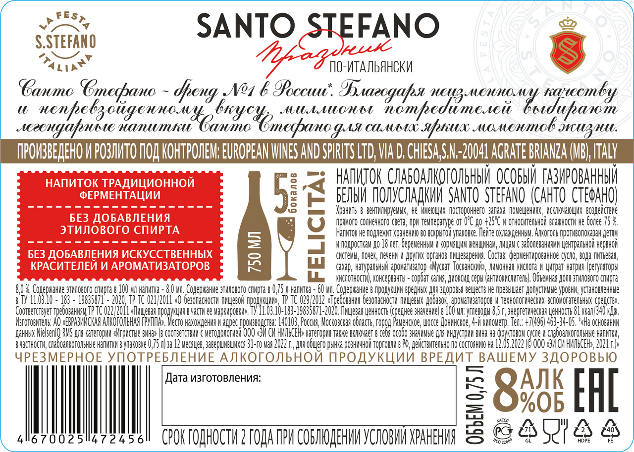Приятный игристый напиток, полюбившийся миллионам потребителей в России. Разработан и изготовлен под контролем специалистов из Италии. Для производства напитка используется только высококачественное сырье, полностью отсутствуют красители и ароматизаторы. Санто Стефано соответствует стандартам Регламента Европейского Союза и требованиям ГОСТ РФ.
