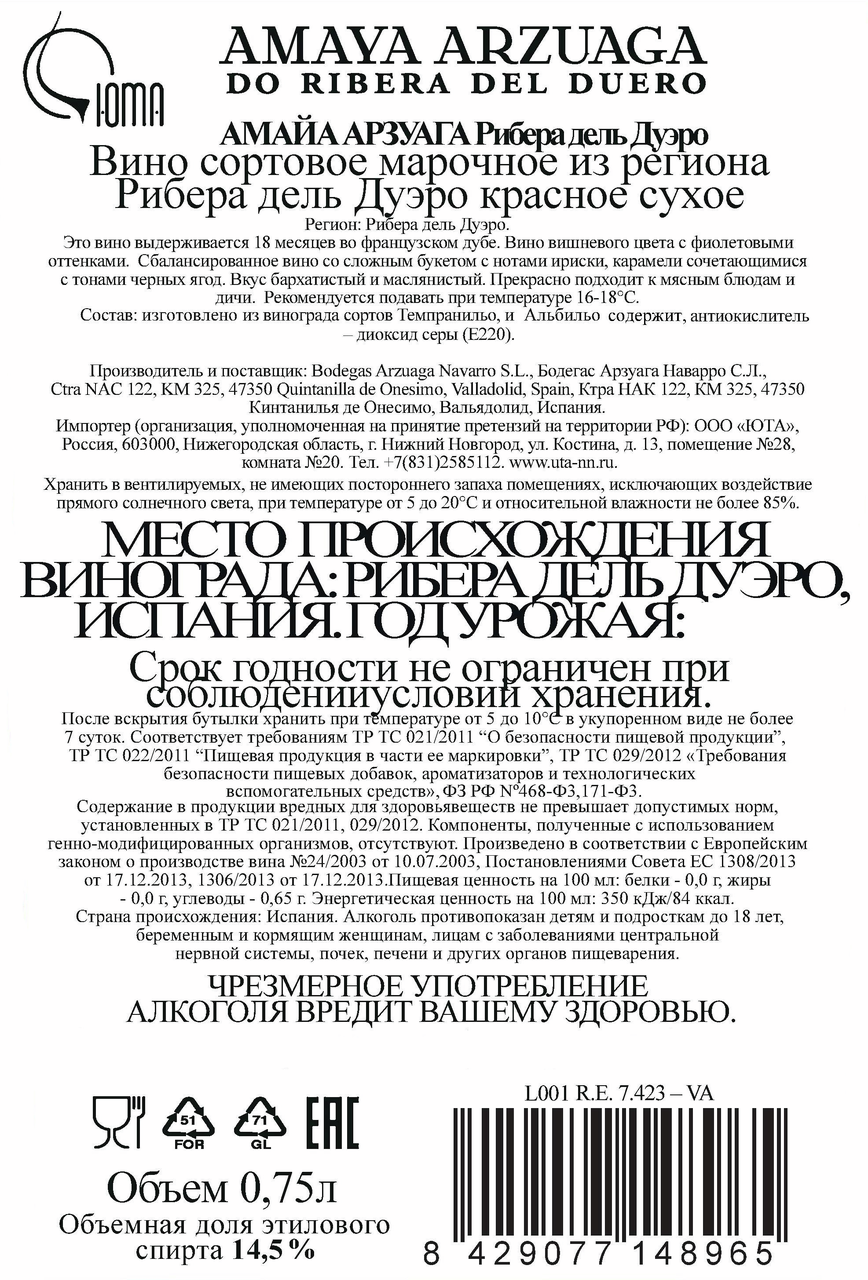 Вино Amaya Arzuaga Ribera красное сухое в подарочной упаковке, 0.75л