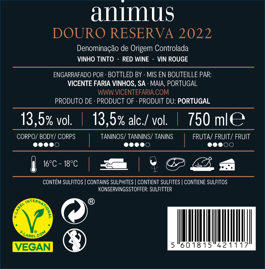 Animus Reserva - это гармоничное сочетание трех тщательно отобранных португальских сортов винограда. Оно обладает фруктовым и интенсивным ароматом, дополненным гладкими, округлыми танинами. Это вино обладает сильным характером, но при этом остается восхитительно легким для питья.