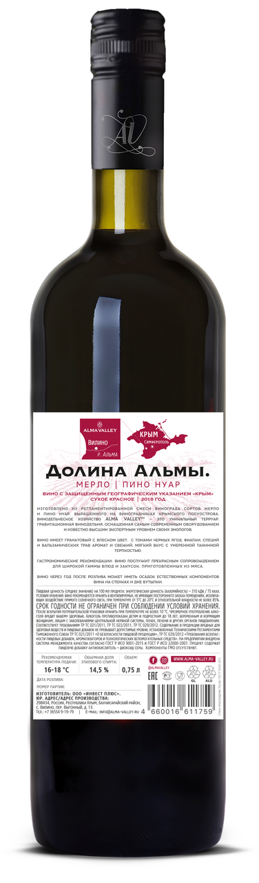 Красное сухое вино, для изготовления которого используют виноград сортов Мерло и Пино Нуар, выращенный в Альминской Долине. Местный уникальный терруар позволяет получать виноград высочайшего качества. Здесь преобладает мягкий средиземноморский климат с умеренным количеством осадков, морской бриз обеспечивает хорошую вентиляцию. Почвы преимущественно представляют собой темно-бурые суглинки, а по долинам рек — богатые карбонатные черноземы. В недрах укрываются слои известняка и плотного мергеля. Виноград собирается вручную по достижении ягодами оптимальной спелости. Урожайность не превышает 6 т/га. Ферментация протекает при контролируемой температуре в емкостях из нержавеющей стали. Вино выдерживается на осадке преимущественн�� в стальных чанах, малая часть (33%) — в бочках из французского дуба. После смешивания вино разливается по бутылкам. Со временем возможно образование осадка, что свидетельствует о натуральности вина.