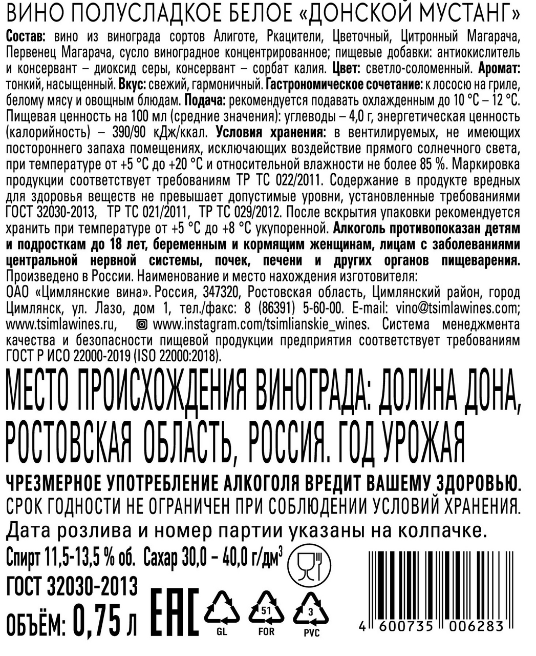Для изготовления вина Донской Мустанг Полусладкое белое используется виноград сортов Ркацители, Алиготе, Первенец Магарача, Цитронный Магарача и Цветочный, который выращивается на собственных виноградниках компании в уникальных природно-климатических условиях Цимлянского района. Виноград собирается по достижении ягодами оптимальной спелости и подвергается традиционной винификации. Полученное вино обладает приятным и питким вкусом с хорошим балансом сладости и кислотности. Вино станет отличным сопровождением холодных закусок, дичи и фруктовых салатов, его также можно подать в качестве аперитива.