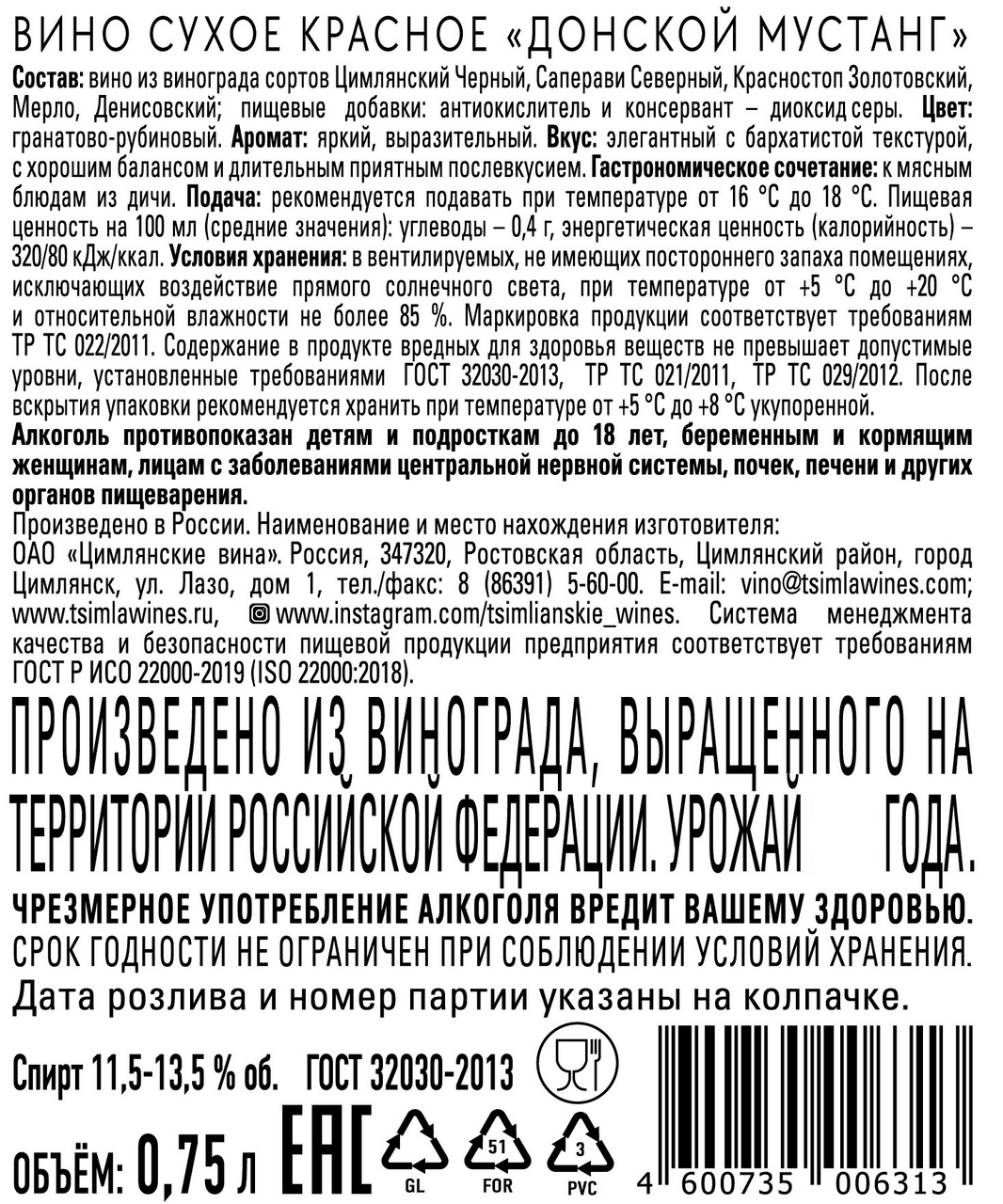 Для изготовления вина Донской Мустанг Сухое красное используется виноград сортов Саперави Северный, Цимлянский Черный, Красностоп Золотовский, Мерло и Денисовский, который выращивается на собственных виноградниках компании в уникальных природно-климатических условиях долины Дона. Долина Дона протянулась от Ростова на востоке до Цимлянского моря на западе, а сами виноградники раскинулись по берегам Дона. Климат долины достаточно сложный для культивирования винограда, с жарким летом и долгой, морозной зимой. Вегетационный период, как правило, непродолжительный. Влияние реки обеспечивает значительные колебания суточных температур. На левом берегу Дона преобладают черноземы, а на правом — ракушечник. Урожай собирается по достижении яго��ами оптимальной спелости. Винификация проходит по традиционному методу. Вино идеально сочетается с различными блюдами из красного мяса, сырами, холодными закусками, барбекю.