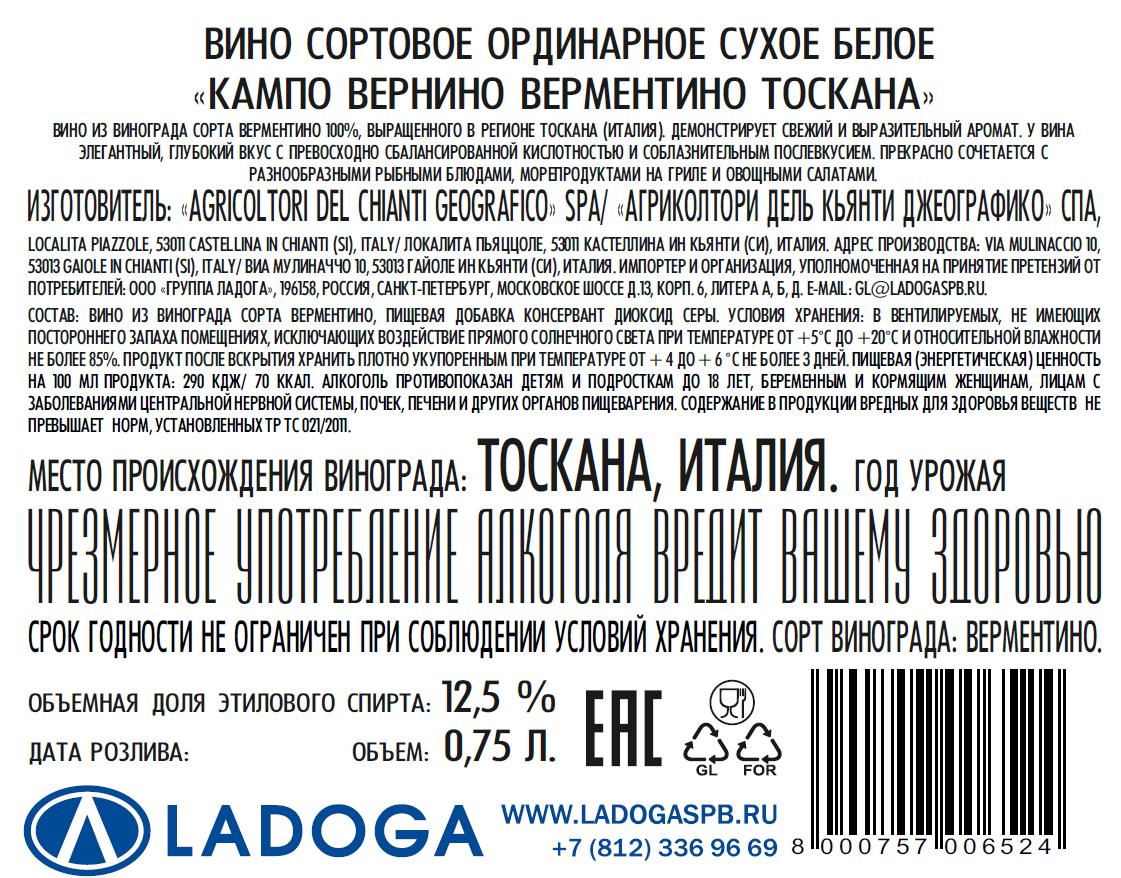 Белое сухое вино Geografico Campo Vernino Vermentino Toscana произведено из винограда сорта Верментино, выращенного в регионе Тоскана, Италия. После сбора урожая, который проводится по достижении ягодами оптимального уровня спелости, виноград отправляется на винодельню, где ферментируется при контролируемой температуре. Перед бутилированием вино отстаивают и фильтруют. Вкус вина питкий, мягкий, гармоничный, с тонами тропических фруктов, белых цветов и полевых трав, живой кислинкой и интригующим послевкусием. Вино замечательно в качестве аперитива, а также составит прекрасную пару летним салатам, морепродуктам и белой рыбе, приготовленной на гриле. Потенциал хранения составляет 2-3 года.