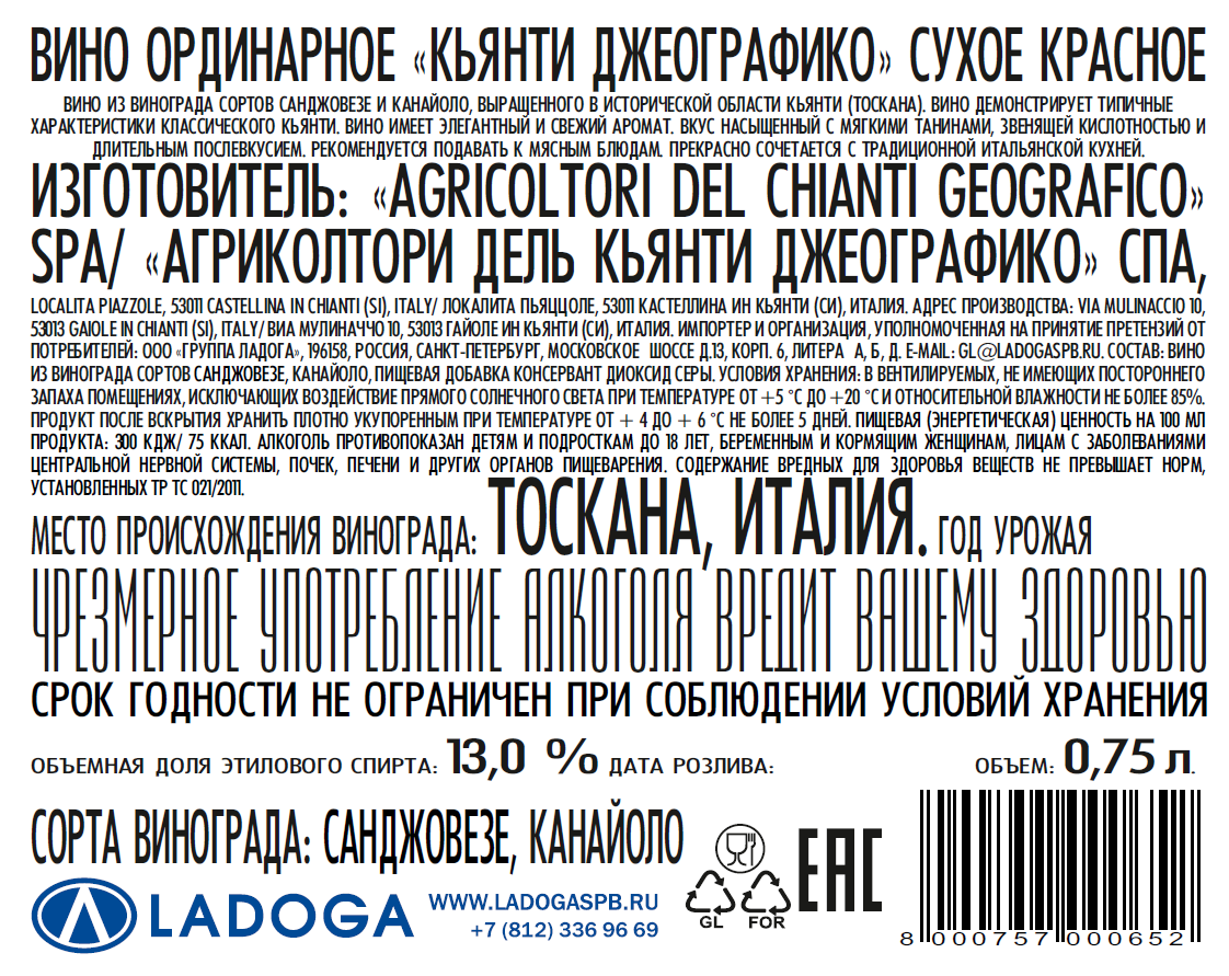 Виноград сортов Санджовезе, Канайоло, консервант - диоксид серы.