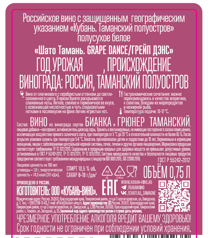 Вино от платинового с серебристым оттенком до светло-соломенного цвета. В ярком букете раскрываются слаженные ноты. Легкое, свежее и гармоничное во вкусе, с освежающей кислотностью и чуть сладковатыми нотками в послевкусии на фоне легких игристых нот. Гастрономические сочетания: можно порекомендовать в качестве аперитива, к салатам, блюдам из морепродуктов и нежирной рыбе. Температура подачи: 10-12С.Свежее, легкое белое полусухое вино, изготовленное из винограда сортов Бианка и Грюнер Таманский. Для создания серии Grape Dance была проведена тщательная селекция сортов винограда с выраженной освежающей доминантой, а использование современных эно-лабораторных исследований и применение передовых технологий позволило получить уникальные сенсорные свойства. Сбор винограда осуществляется при низком уровне сахара. Плоды мягко прессуется, полученное сусло осветляется с помощью флотации. Ферментация проходит в емкостях из нержавеющей стали при постоянно контролируемой температуре, после чего вино выдерживается на тонком дрожжевом осадке не более 2-х месяцев.