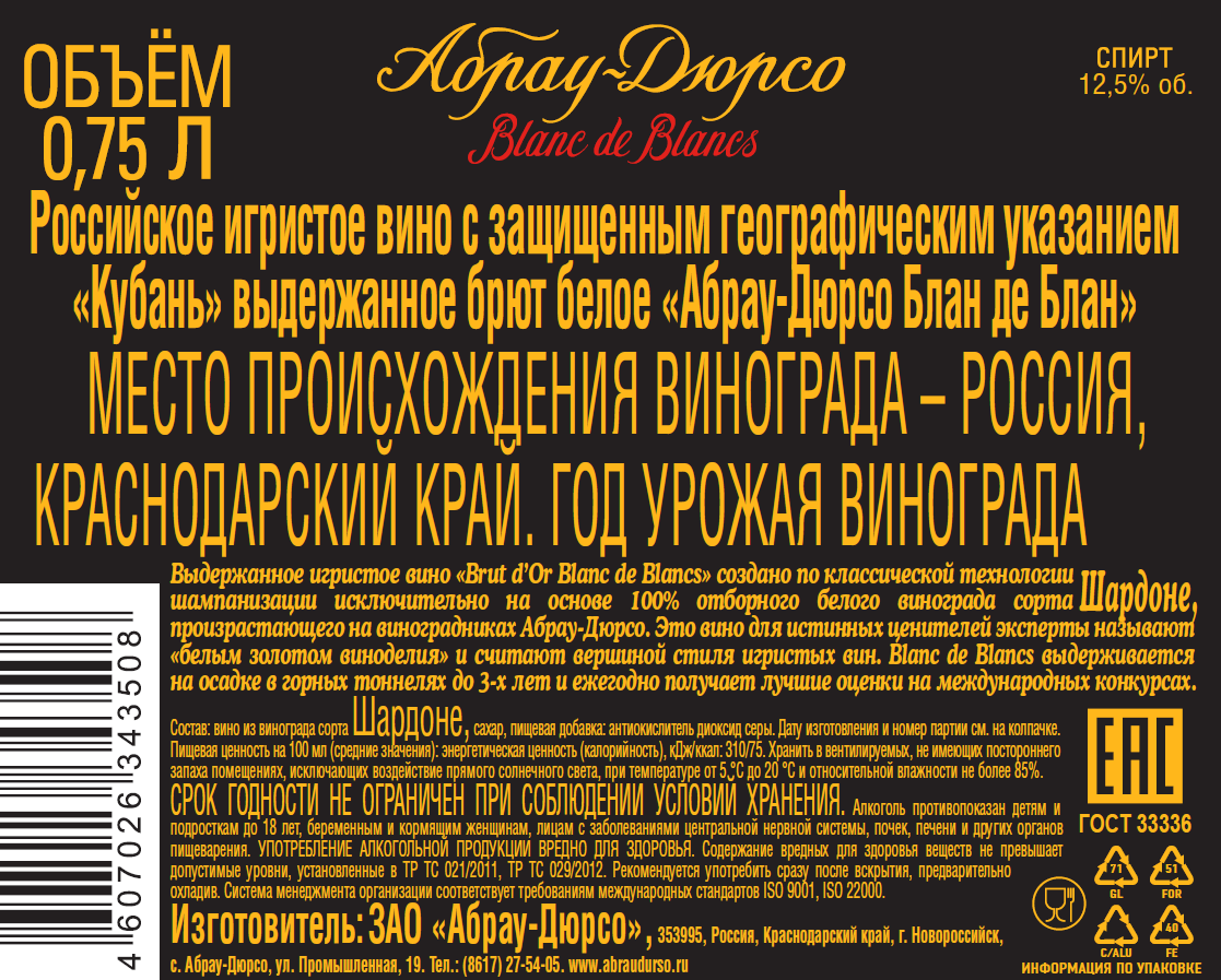 Коллекция Brut d’Or, состоящая из четырех моносортовых вин, создается из винограда, собранного вручную с лучших участков виноградников Абрау-Дюрсо. В процессе создания вин используются только целые гроздья и кюве (cuvee) - сок первого отжима, что позволяет сохранить всю полноту и многогранность сортового аромата. Игристые вина коллекции выдерживаются в горных тоннелях Абрау-Дюрсо не менее трех лет и имеют прекрасный потенциал к дальнейшему хранению. Brut d’Or Blanc de Blanc - премиальное игристое вино, жемчужина дома Абрау-Дюрсо. В его производстве используется отборный виноград сорта Шардоне, произрастающий на собственных виноградниках компании. Игристое вино лучше всего подавать в качестве аперитива, оно станет замечательной гастрономической парой к сложным блюдам из морепродуктов.