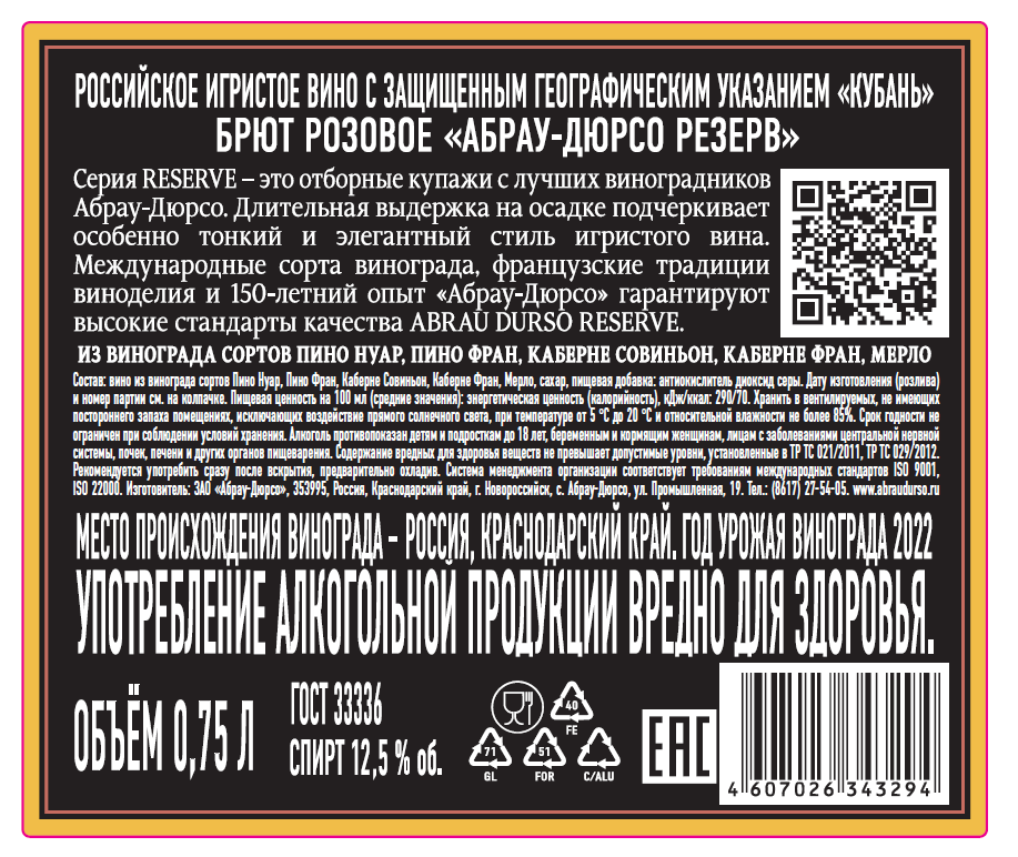 Линейка Abrau-Durso Reserve - новинка в коллекции резервуарных игристых вин от Абрау-Дюрсо. Для создания этой линейки используется только кюве (cuve) - сок первого отжима отборного винограда, собранного на собственных виноградниках компании. Важное преимущество вин - более долгий срок выдержки, он составляет не менее девяноста дней. Вина из этой линейки отличаются легкостью, свежестью, яркостью букета и демонстрируют новый стандарт качества для всей категории вин, произведенных методом Шарма. Абрау-Дюрсо Резерв Брют Розе - розовое игристое вино защищенного географического указания, изготовленное из винограда сортов Пино Нуар, Пино Фран и Каберне Совиньон с лучших виноградников хозяйства. Оно обладает округлым, мягким вкусом со свежей кислотностью и нежным ягодным ароматом. Вино является превосходным аперитивом, идеально сочетается с ягодными и фруктовыми десертами, создаст прекрасное настроение за праздничным столом.