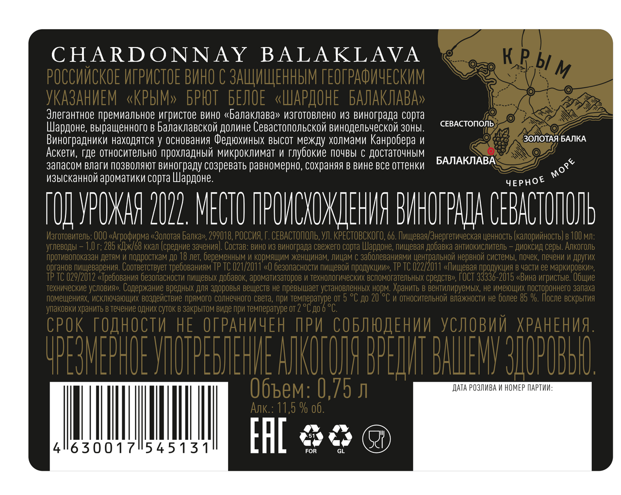 Белое игристое вино, созданное из винограда сорта Шардоне, который произрастает на виноградниках Балаклавского района. Этот район демонстрирует одну из красивейших бухт планеты — Балаклавскую бухту. Балаклава является идеальным местом для настоящих ценителей хорошего вина и изысканных блюд. Сбор урожая проводится вручную в сентябре, на винодельне ягоды подвергаются тщательной сортировке с последующей вторичной ферментацией (метод Шарма-Мартинотти) в емкостях из нержавеющей стали при контролируемой температуре не выше 15 С. Вторичная ферментация длится около 20 дней. Перед бутилированием, игристое вино подвергается фильтрации.
