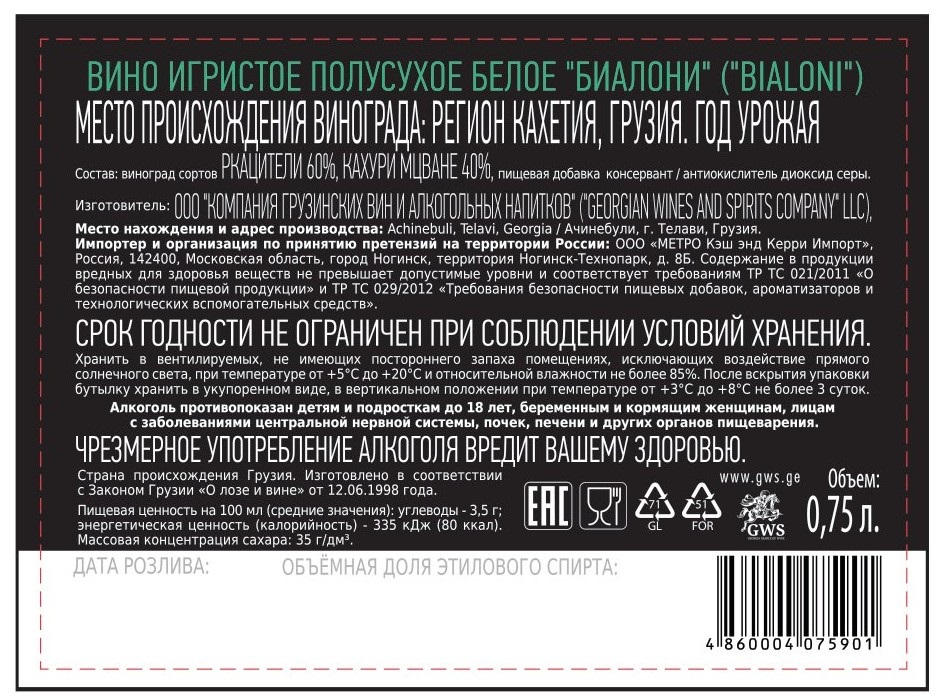 Только в METRO. Игристое вино Bialoni - это искрящаяся элегантность из солнечной Кахетии. Насладитесь свежим и гармоничным вкусом с тонкими фруктовыми нотами, который сделает ваш праздник по-настоящему изысканным.