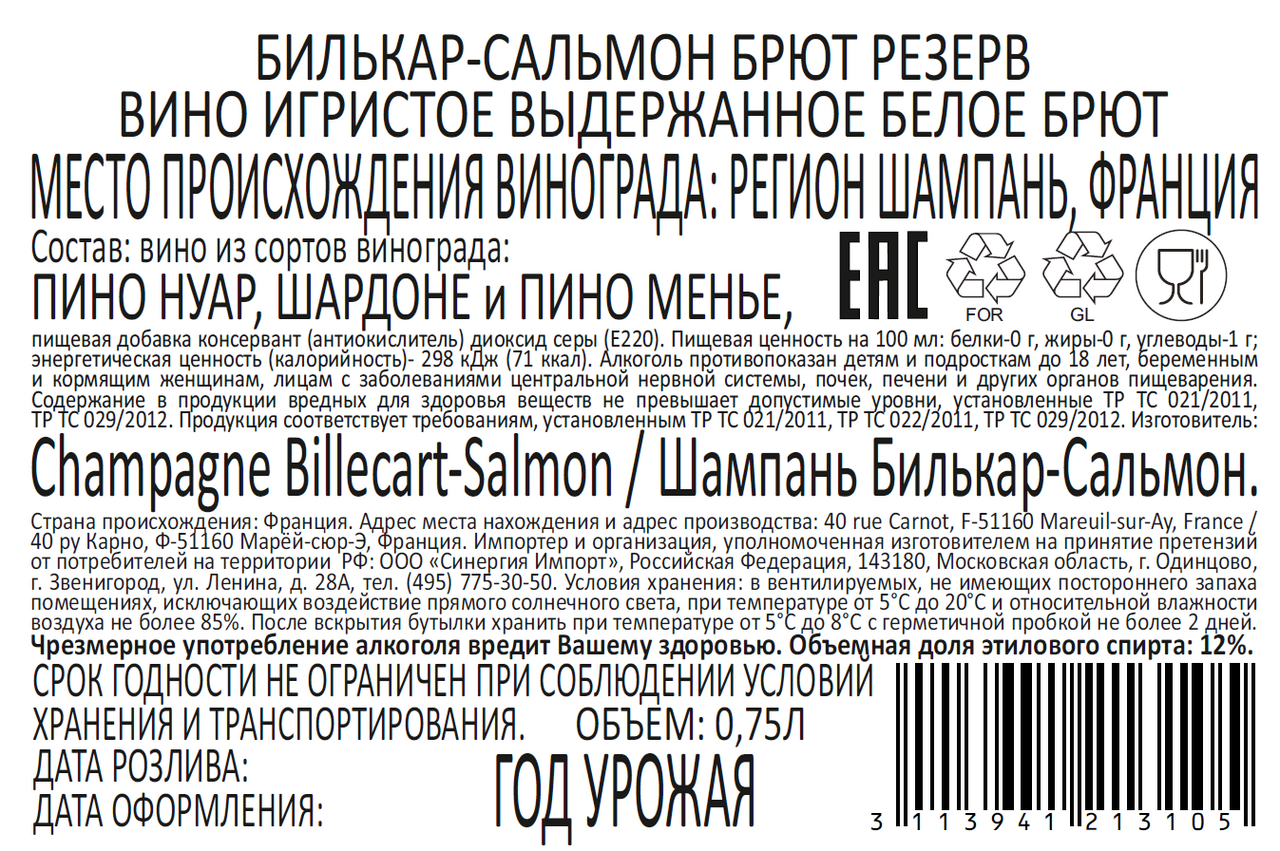 Вино игристое Billecart Salmon в подарочной упаковке белое брют, 0.75л