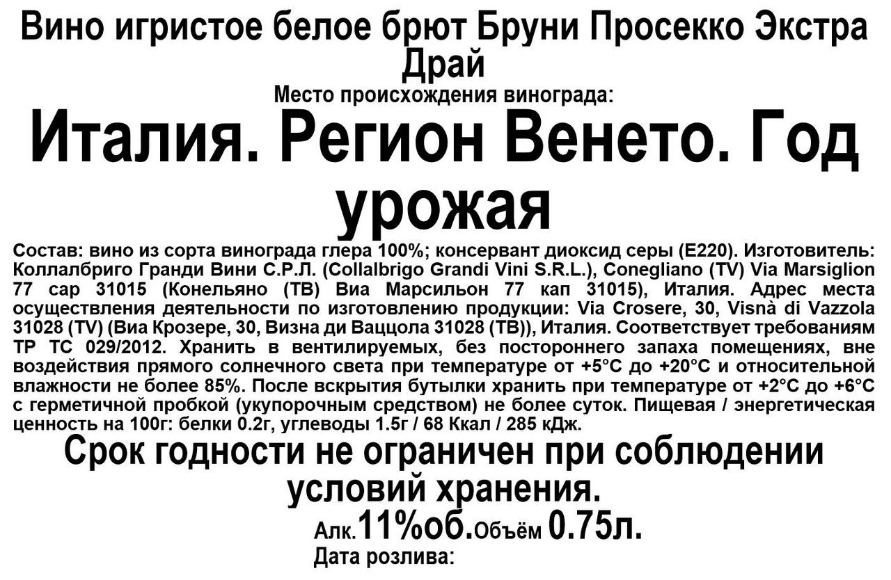 Вино игристое Bruni Prosecco Extra Dry в подарочной упаковке белое брют, 0.75л