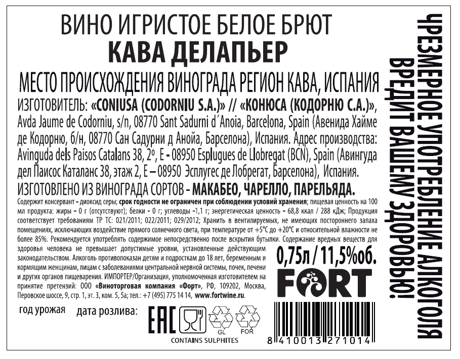 Виноград сортов Макабео, Чарелло, Парельяда, консервант - диоксид серы.