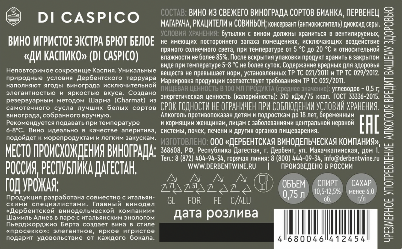 Из отборного винограда, собранного вручную. В каждом бокале вина Di Caspico - отражение тех ярких эмоций, которые дарит Каспий. Белое экстра сухое игристое вино, изготовленное из винограда сортов Бианка, Ркацители, Первенец Магарача и Совиньон Блан. Винификация сусла из ягод, выращенных на собственных виноградниках компании и собранных вручную, проходит по методу Шарма. Перед тем, как открыть для себя беззаботное спокойствие солнечного Юга, игристое вино рекомендуется охладить до 6-8С.