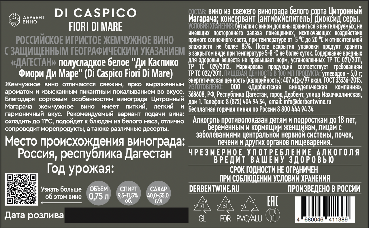 Жемчужное полусладкое белое вино, изготовленное из винограда сорта Цитронный Магарача, который выращивается на собственных виноградниках Дербентской Винодельческой Компании, расположенных в солнечном Дагестане. Виноград собирается вручную по достижении ягодами оптимальной спелости, тщательно сортируется и ферментируется при контролируемой температуре в стальных чанах. В дальнейшем игристое вино производится в соответствии с методом Шарма. Перед тем, как открыть для себя беззаботное спокойствие солнечного Юга, игристое вино рекомендуется охладить до 8С.