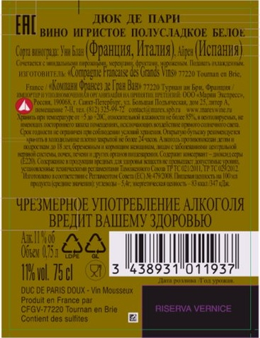 Вино выпускается на заводе французской компании CFGV (Compagnie Francaise des Grands Vins) - крупнейшего производителя игристых вин в странах Европы, хорошо зарекомендовавшего себя на рынке. Продукт, выпускаемый под брендом Дюк де Пари - является достойным образцом доступной стоимости и превосходного вкуса. Производится из белых сортов винограда традиционным способом. Игристое вино светло-соломенного цвета с продолжительной игрой пузырьков и мелкозернистой пеной. Демонстрирует округлый, приятный вкус с освежающей кислотностью и фруктовым послевкусием. В аромате преобладают оттенки луговых медоносов, засахаренных фруктов, спелых персиков и белого инжира. Рекомендуется подавать хорошо охлаждённым на аперитив, к лёгким салатам, закускам.
