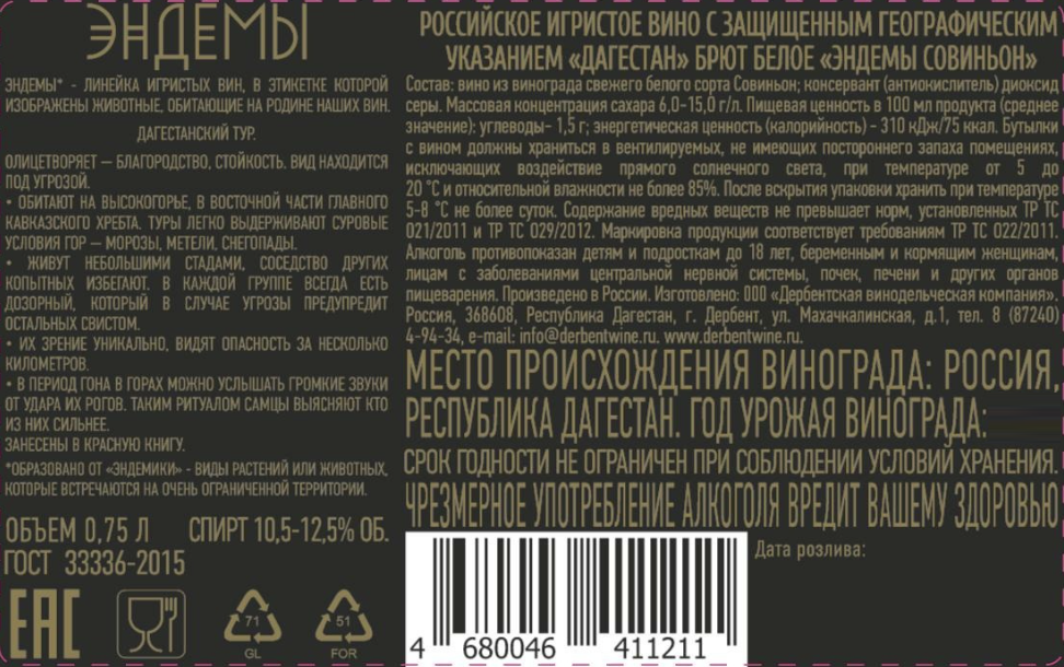 Вина линейки Эндемы - премиальный продукт Дербентской Винодельческой Компании. Линейка включает как выдержанные тихие, так и моносортовые игристые вина. Для изготовления вин используют исключительно местный виноград, согретый жарким солнцем Дербента и выращенный на древних песчаниках, напитанных волнами Каспийского моря. Этикетку каждого вина украшает изображение одного из животных, обитающих в пределах Кавказского хребта. Таких представителей фауны, живущих на очень ограниченной территории, называют эндемиками. Эндемы Совиньон Брют - белое игристое вино, изготовленное из винограда сорта Совиньон Блан, который выращивается на собственных виноградниках Дербентской Винодельческой Компании, расположенных в солнечном Дагестане. Виноград собирается вручную по достижении ягодами оптимальной спелости, тщательно сортируется и ферментируется при контролируемой температуре в стальных чанах. В дальнейшем игристое вино производится в соответствии с итальянским методом Шарма-Мартинотти, который предполагает проведение вторичной ферментации в герметичных автоклавах, где полученное ранее базовое вино бродит с сахаром и дрожжами. Выдержка на тонком осадке занимает не менее 3-х месяцев. Этикетку игристого вина украшает изображение кавказского тура, редкого представителя фауны Кавказа, занесенного в Красную книгу.