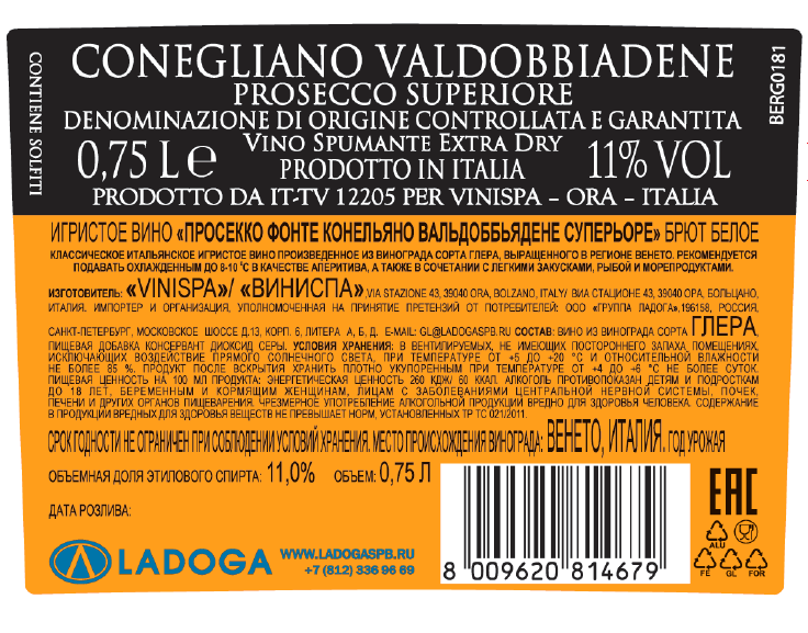 Виноград сорта Глера, пищевая добавка консервант диоксид серы.