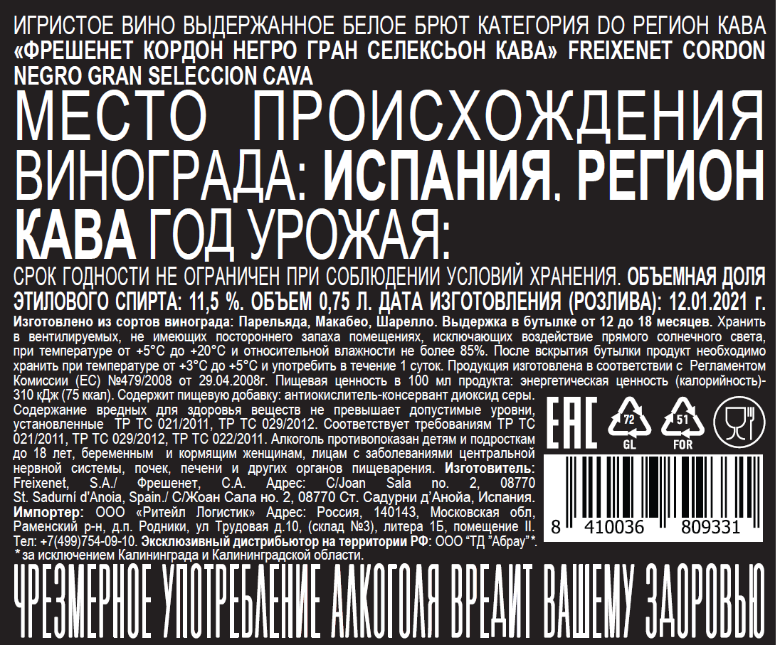 Вино игристое Freixenet Cordon Negro белое брют, 0.75л - одно из самых популярных игристых вин в мире, идеально подходящее для любого случая. Это титулованная легкая кава, которая идет в ногу со временем и которую ценят за ее исключительную свежесть. Кордон Негро изготовлено из трех белых испанских сортов винограда - Макабео, Шарелло и Парельяда. Макабео насыщает вино цветом, фруктовым ароматом и средне-высокой кислотностью - характеристиками, имеющими решающее значение для производства игристого вина. Чарелло дает надежную кислотность и способствует мощности и глубине. Парельяда является звездой всех игристых вин, придавая им неповторимую свежесть. Соединенные вместе, эти сорта слагаются в красивое, фруктовое и утонченное игристое вино. Вино производится по методу Шампенуаз, с вторичным брожением в бутылках и выдержкой в них же на протяжении 12-18 месяцев.