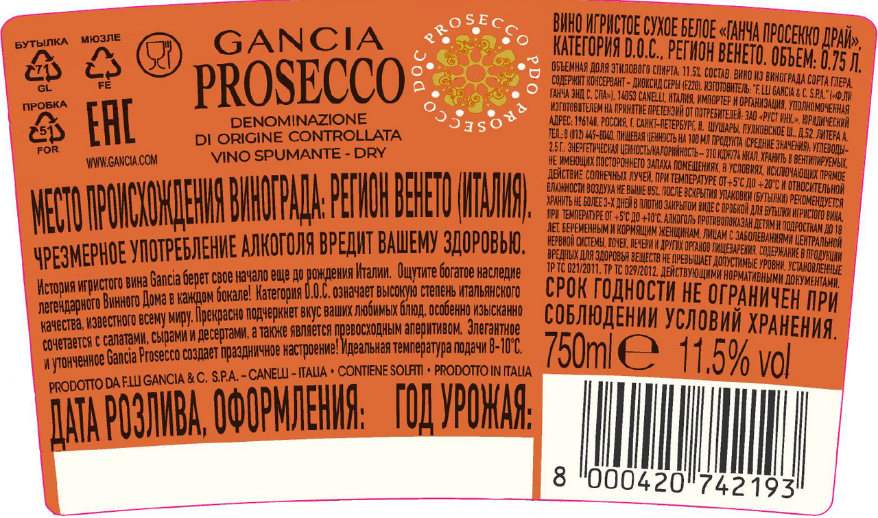 Вино игристое Gancia Prosecco белое сухое в подарочной упаковке, 0.75л — известное итальянское сухое игристое вино, которое изготавливается из винограда сорта Глера (Просекко) по традиционному рецепту методом Шарма-Маринотти. Вино имеет неповторимый интенсивный аромат и свежий, элегантный, хорошо сбалансированный вкус со слегка колючими пузырьками. Такой напиток характеризуется блестящим светло-соломенным оттенком и насыщенным ароматом спелых фруктов. Подавать белое игристое вино рекомендуется охлажденным до температуры 6-8С в специальных, слегка зауженных кверху бокалах - так напиток в полной мере раскроет свой богатый вкус и многогранный аромат. Игристое вино составит гармоничный дуэт с закусками и основными блюдами из моллюсков и других морепродуктов, приготовленных на пару. Также напиток может использоваться в качестве самостоятельного аперитива.