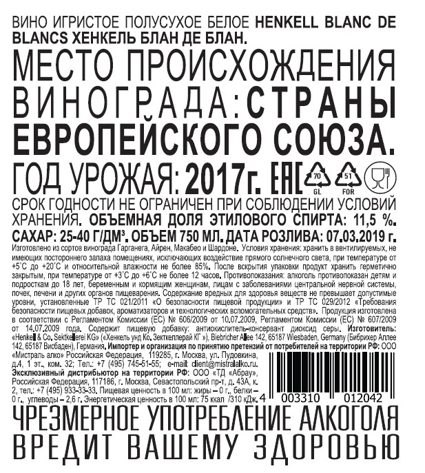Виноград сортов Гарганега, Айрен, Макабео, Шардоне, консервант - диоксид серы (Е220).