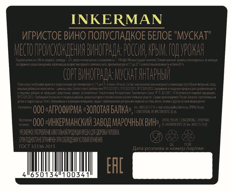 Вино игристое Inkerman Muscat белое полусладкое, 0.75л