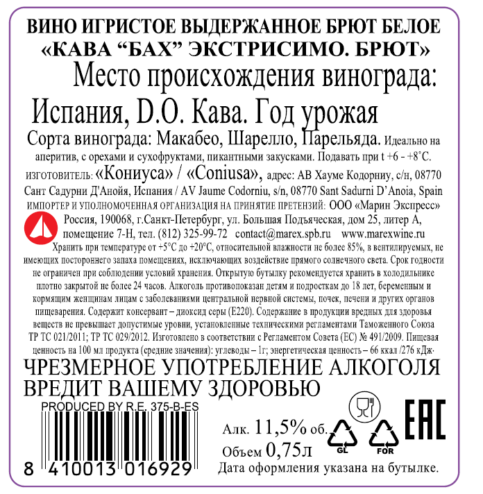 Вино игристое Bach Extrisimo Brut Nature Cava белое экстра брют, 0.75л