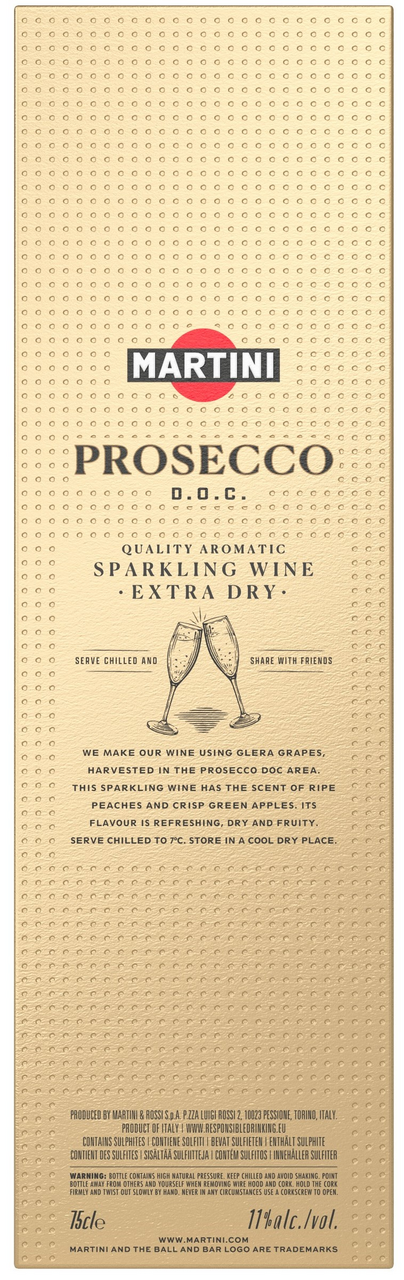 Martini Prosecco обладает высоким статусом D.O.C в иерархии итальянских вин. Производство данного игристого вина контролируется государством на каждом этапе, начиная со сбора урожая, и соответствует высоким стандартам качества. Контролируемое наименование по происхождению. Цвет: Светло-золотистый с легким зеленоватым отблеском. Свежий цветочно-фруктовый аромат с нотками груши и зеленого яблока. Яркий, сбалансированный вкус с сочными фруктовыми нотами и легким минеральным послевкусием. Подавать хорошо охлажденным (+5С), в винном бокале. Производится из винограда сорта Глера (Просекко), который выращивается в регионе Венето на северо-востоке Италии. Икона итальянского виноделия, компания Мартини уже давно занимается производством Prosecco в Венето. В августе 2009 года система классификации вина была повышена с IGT на DOC. Теперь Prosecco называется вино, созданное только в двух регионах Италии - Венето и Фриули-Венеция-Джулия из высококачественного винограда, что контролируется на правительственном уровне.