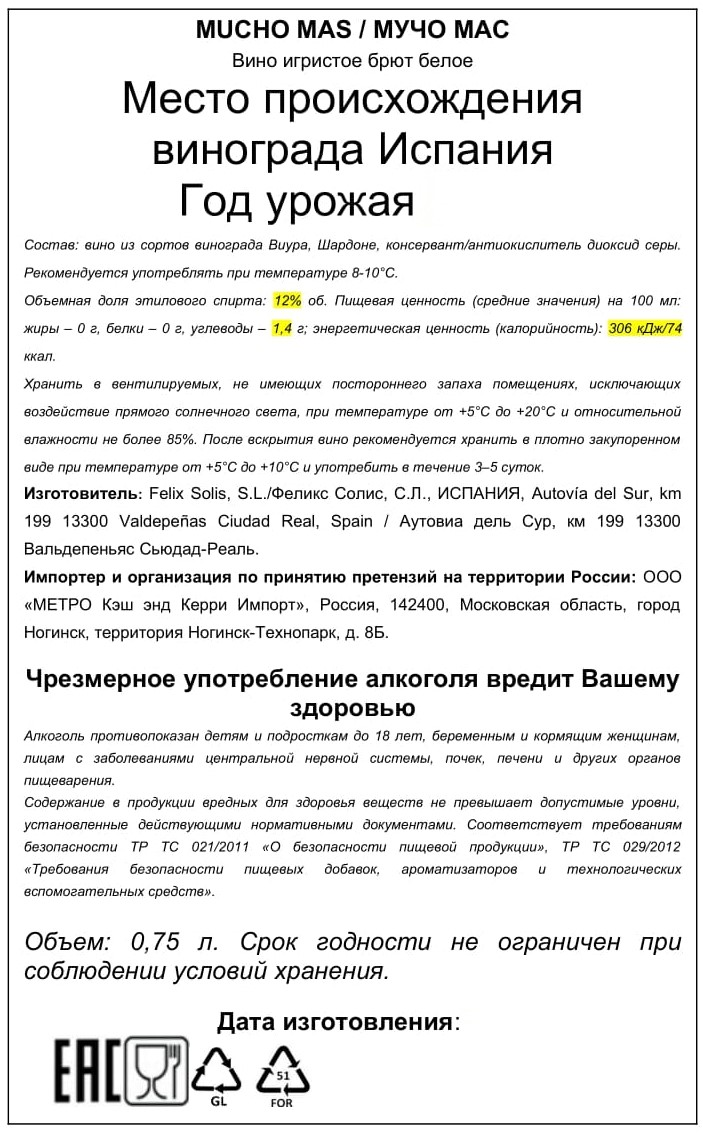 Вино игристое Mucho Mas белое брют, 0.75л
