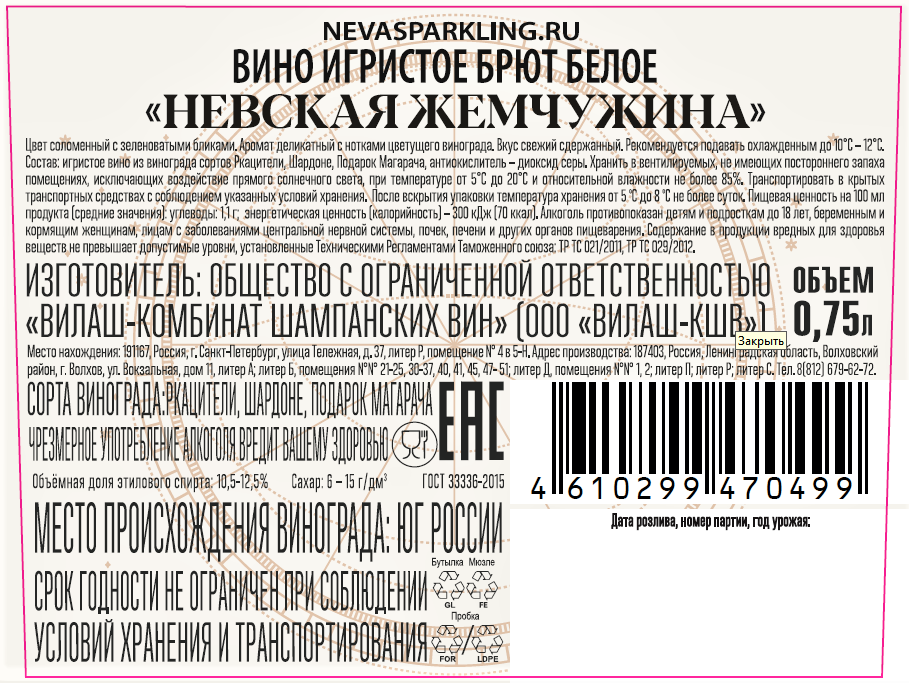 Вино игристое Невская жемчужина белое брют, 0.75л