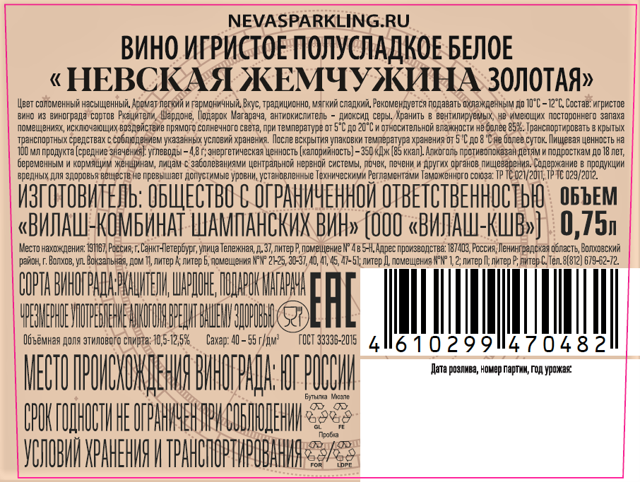 Вино игристое Невская жемчужина Золотая белое полусладкое, 0.75л