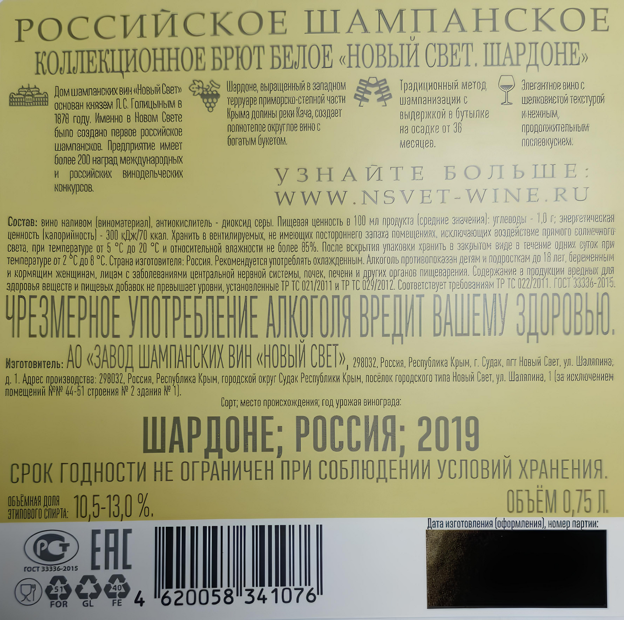 Шампанское российское Новый Светъ Шардоне коллекционное белое брют, 0.75л
