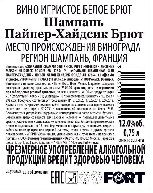 Набор, состоящий из бутылки шампанского Piper-Heidsieck Brut объемом 750 мл и двух бокалов-флюте, станет достойным презентом дорогому и близкому человеку. Игристое вино сочетает в себе 60 различных сборов винограда, что прекрасно представляет разнообразие регионов Шампани. Около 50 из них собираются, обрабатываются и наблюдаются отдельно, чтобы сохранить уникальный вкус каждого урожая. Хранение их в отдельных бочках создает богатейшую палитру вкусовых качеств. Это вино — неотъемлемый атрибут мероприятий кино-индустрии, таких как вручение премий Оскар или кинофестиваль в Каннах. Любимое шампанское Мерлин Монро.