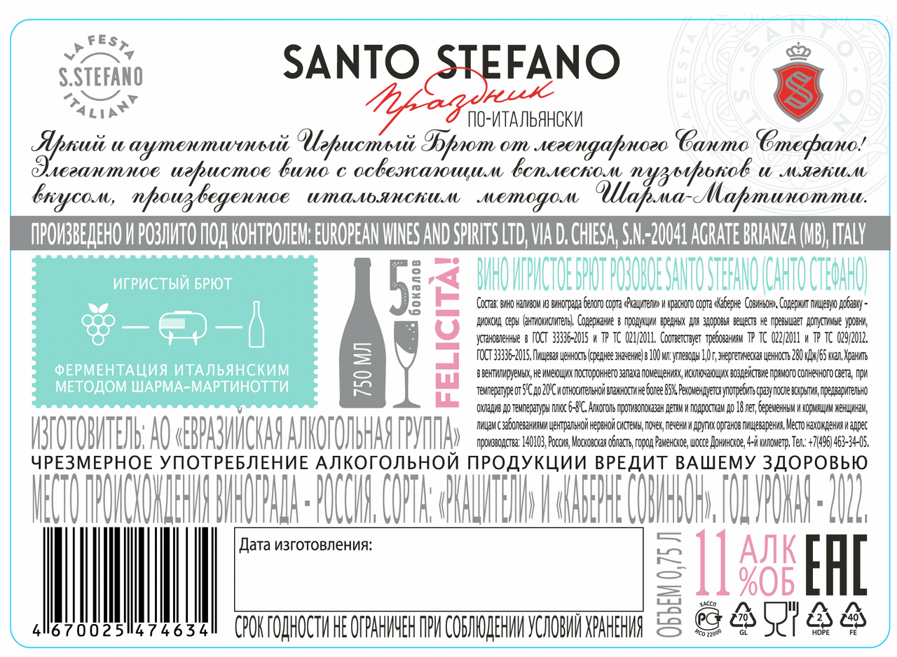 Легкое и свежее вино, которым можно наслаждаться как самостоятельно, так и в сочетании с различными блюдами. Яркое и сочное розовое игристое вино из винограда сортов Бианка и Августин с добавлением небольшого количества Каберне Совиньон для придания напитку красивого цвета и ягодного аромата. Каждый этап винификации проходит под контролем специалистов из Италии. Игристое вино создается в соответствии с традиционным итальянским методом Шарма-Мартинотти. Santo Stefano Brut Rose - освежающий праздник по-итальянски.