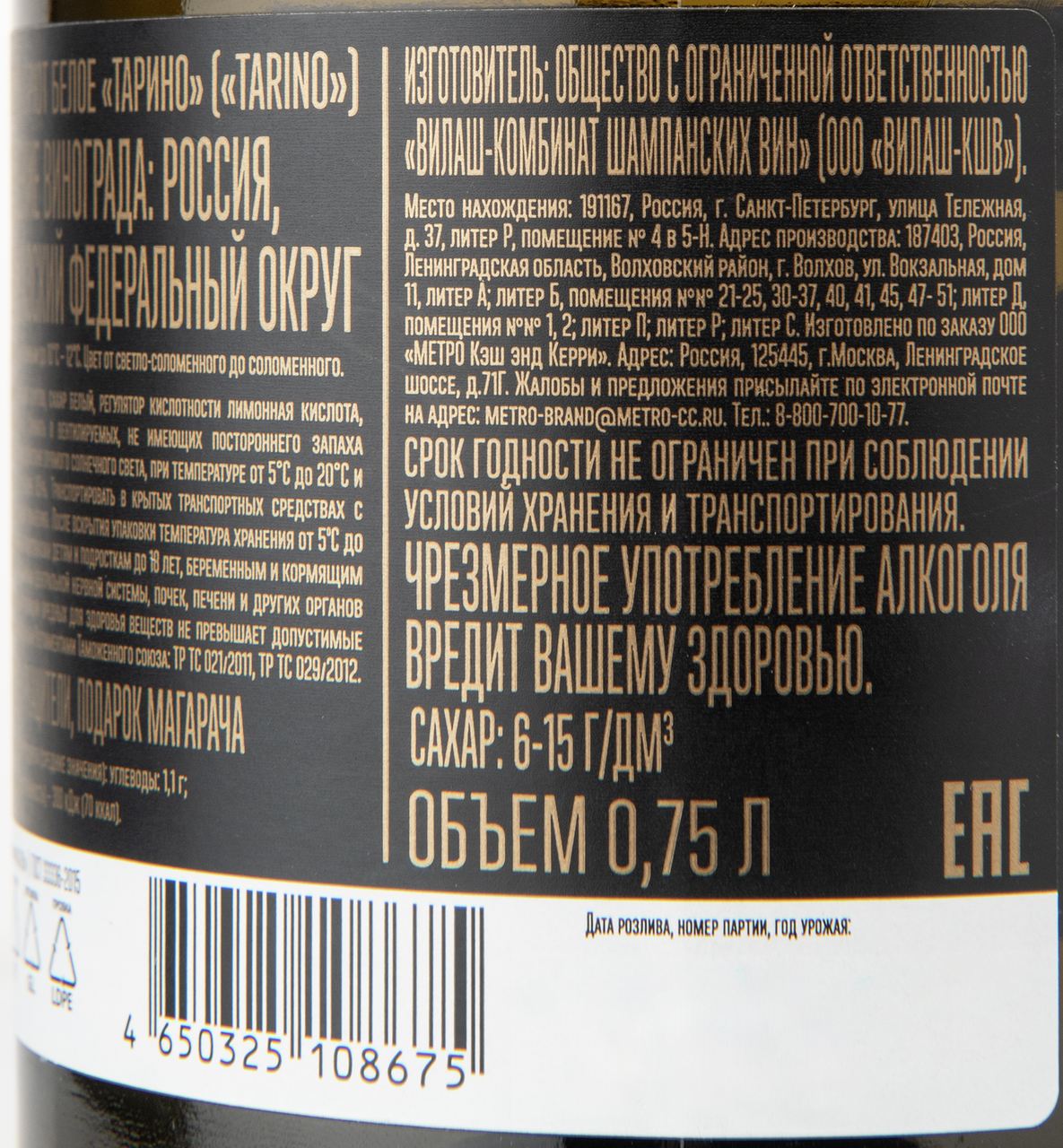 Вино из винограда белых сортов, сахар белый, регулятор кислотности лимонная кислота, антиокислитель диоксид серы.
