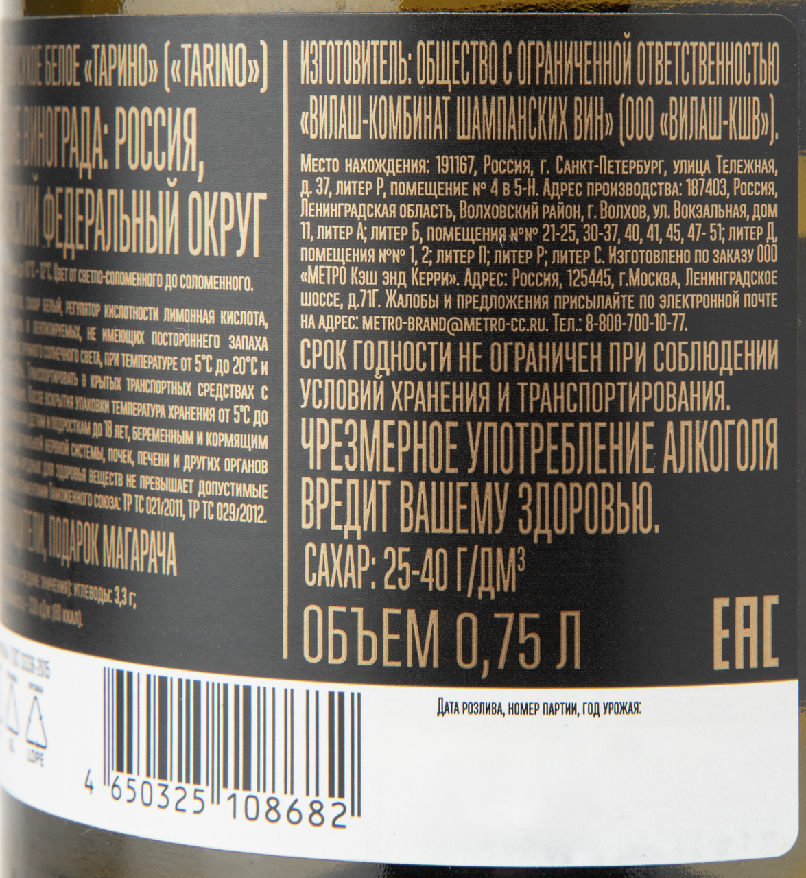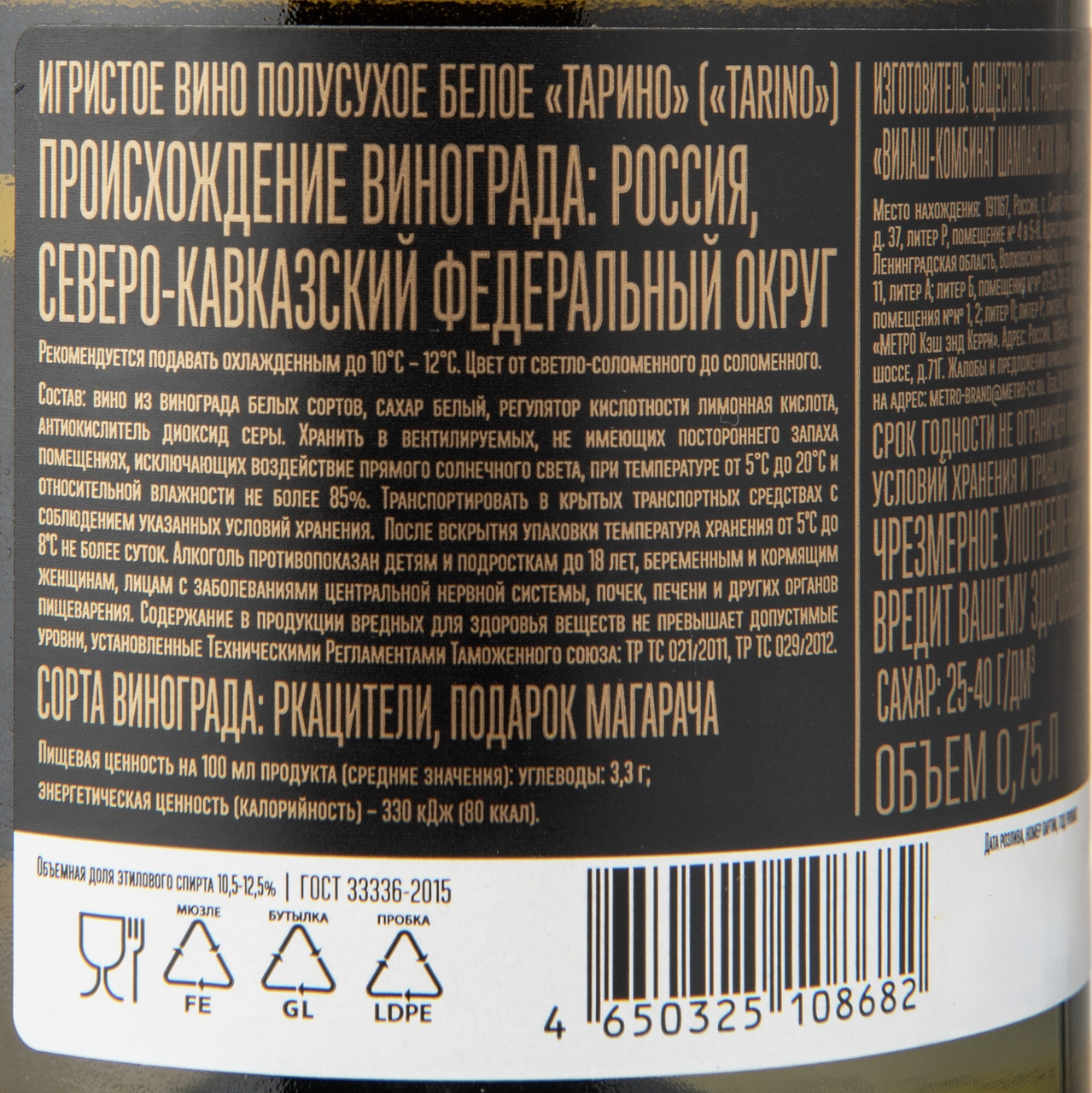 Виноматериалы столовые из винограда сортов Ркацители, Подарок Магарача, пищевая добавка - консервант, антиокислитель диоксид серы.