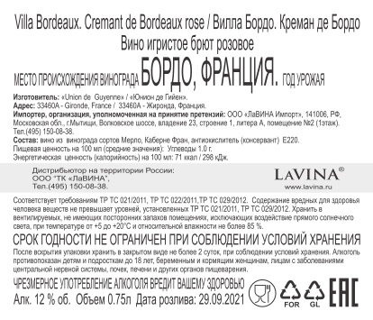 Вино игристое Villa Bordeaux Cremant розовое брют, 0.75л