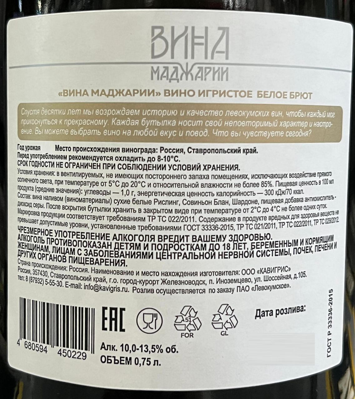 Вина наливом (виноматериала) сухие белые Шардоне, Рислинг, Совиньон Блан, антиоксидант, консервант-диоксид серы.