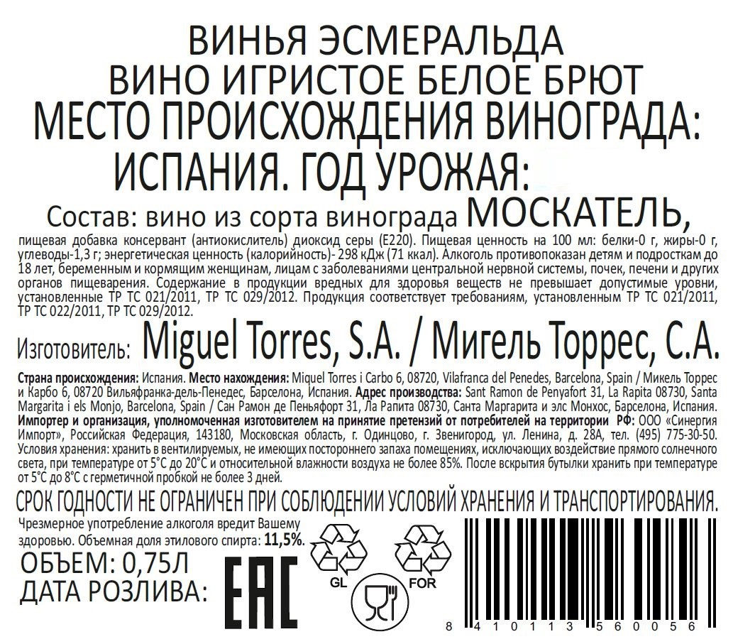 Элегантное, очень свежее белое игристое вино, пробуждающее в воображении красоту Средиземного моря и его уникальные пейзажи. Средиземноморский бриз сочетается с ароматом роз, окружающих владения Торрес, и дает начало семейному сокровищу - винам Vina Esmeralda. Игристое вино изготавливается из винограда сорта Москатель, который собирается вручную в сентябре. Ферментация в стальных резервуарах и отсутствие выдержки позволяют сохранить в вине яркую свежесть и захватывающие сортовые цветочно-фруктовые оттенки. Первая ферментация проходит в течение двух недель, а вторичная - на протяжении десяти дней в герметичных резервуарах из нержавеющей стали при контролируемой температуре 16С.