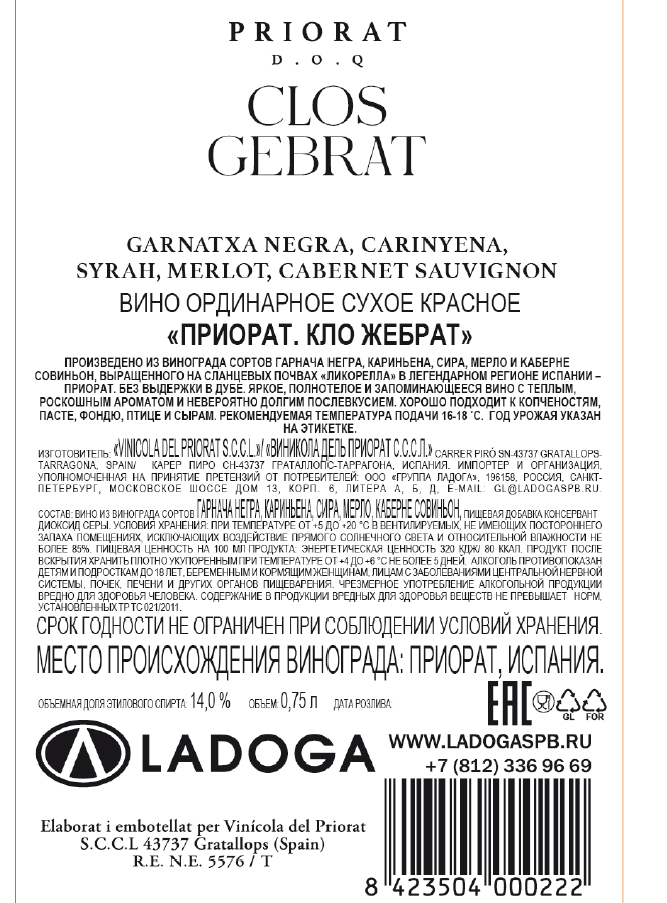 Вино непроницаемо-вишневого цвета. В теплом роскошном аромате этого мощного концентрированного вина черная смородина и черника с минеральными нотками. Яркое полнотелое запоминающееся вино с невероятно долгим послевкусием. В Приорате особый тип почв, так называемая, ликорелла – сланцевые осыпи, блестящие от слюды. Урожайность выращиваемого винограда невелика, так как корням в поисках воды приходится проникать на большую глубину. Вина получаются полнотелыми, необычайно густыми и глубокими, сопровождаемые теплым роскошным плодово-ягодным ароматом. красное сухое вино из региона Приорат, имеющего уникальную почву ликорелла — сланцевые осыпи, блестящие от слюды. Виноград для изготовления вина собирается вручную на 4-х участках: Gratallops, El Lloar, La Vilella Baixa и La Vilella Alta. Урожайность выращиваемых здесь лоз невелика, так как их корням в поисках воды приходится проникать на большую глубину. Урожай сбирается вручную в небольшие ящики максимум по 15кг. Гренаш и Масуэло для Кло Жебра снимается с 45-летних лоз, а Мерло, Сира и Каберне Совиньон - с 30-летних. Ферментация при температуре 25-26C протекает в резервуарах из нержавеющей стали объемом в 25 000 литров с охлаждающей рубашкой. Пост-мацерация длится 20 дней. Затем вино созревает 12 месяцев.