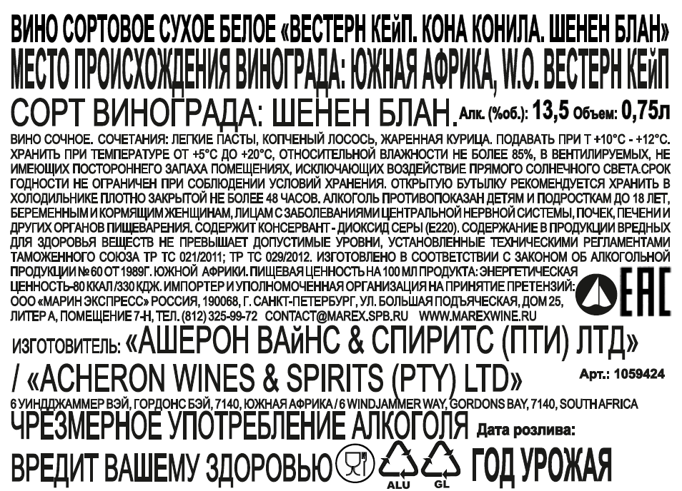 Виноград сорта пинотаж собран с виноградника Бридеклуф. После холодной мацерации, сусло ферментируется при температуре 26-28 градусов в емкостях из нержавеющей стали. Около 10% вина выдерживалась в емкостях из стали и французском дубе. Внешний вид: Рубиновый цвет. Вкус: Сочный, ягодный вкус с бархатистыми танинами и длительным послевкусием с легкими дымными нотами. Аромат: В аромате раскрываются тона спелой сливы, шелковицы и сладких специй. Гастрономические сочетания: Блюда из красного мяса, BBQ. Белое сухое вино из винограда сорта Шенен Блан, впитавшего в себя уникальный характер терруара Западного Кейпа. Собранный виноград очищается от гребней, дробится и мацерируется при низких температурах на протяжении нескольких часов. Далее следуют бережное прессование и декантация сока при температуре 10С в течение 48 часов. Ферментация протекает при температуре 12С.
