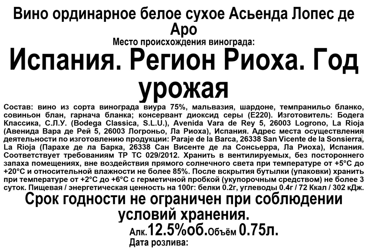 Вино Hacienda Lopez de Haro Blanco белое сухое, 0.75л