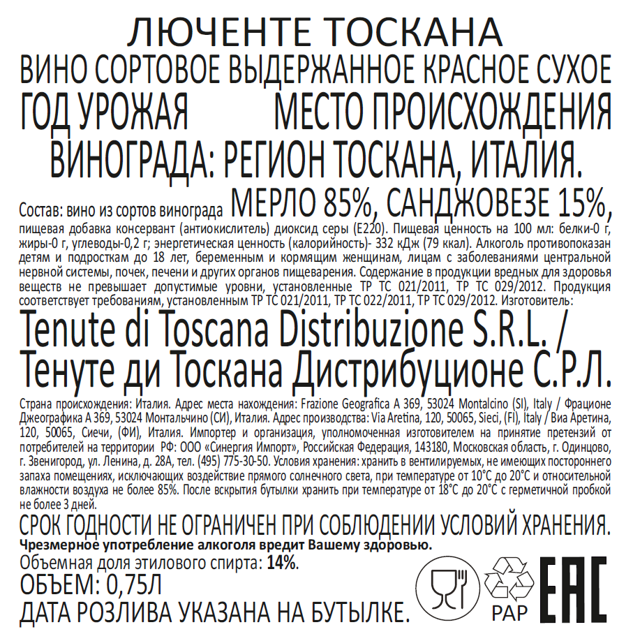 Элегантное красное вино, ключ ко входу в мир поместья Люче. Оно является плодом тщательного отбора лоз поместья, отмеченных особенными характеристиками, которые позволяют создать невероятно приятное фруктовое вино. Как и Люче, Люченте рождается из союза Санджовезе и преобладающего в купаже Мерло. Климатические условия 2021 года и запасы воды в почве способствовали медленному и своевременному созреванию винограда. Мерло был собран 7 сентября, Санджовезе - 13 сентября. После 10-дневной ферментации при 28С, мацерации на кожице в течение 20 дней и яблочно-молочного брожения в стальных терморегулируемых емкостях вино выдерживалось 12 месяцев в деревянных барриках (частично новых, частично - повторно используемых).