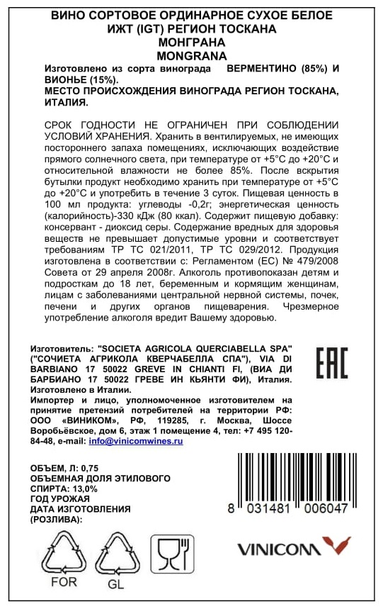 Вино из сорта винограда Верментино, Вионье, консервант диоксид серы (E220).
