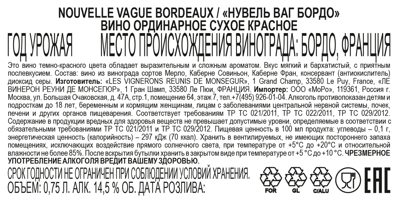 Вино Nouvelle Vague Bordeaux красное сухое, 0.75л