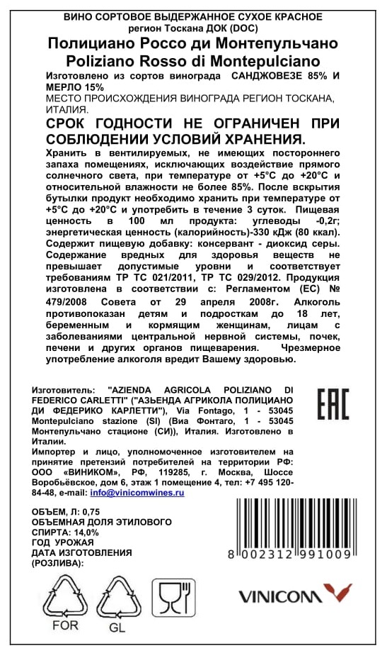 Вино из сорта винограда Мерло, Санджовезе, консервант диоксид серы (E220).