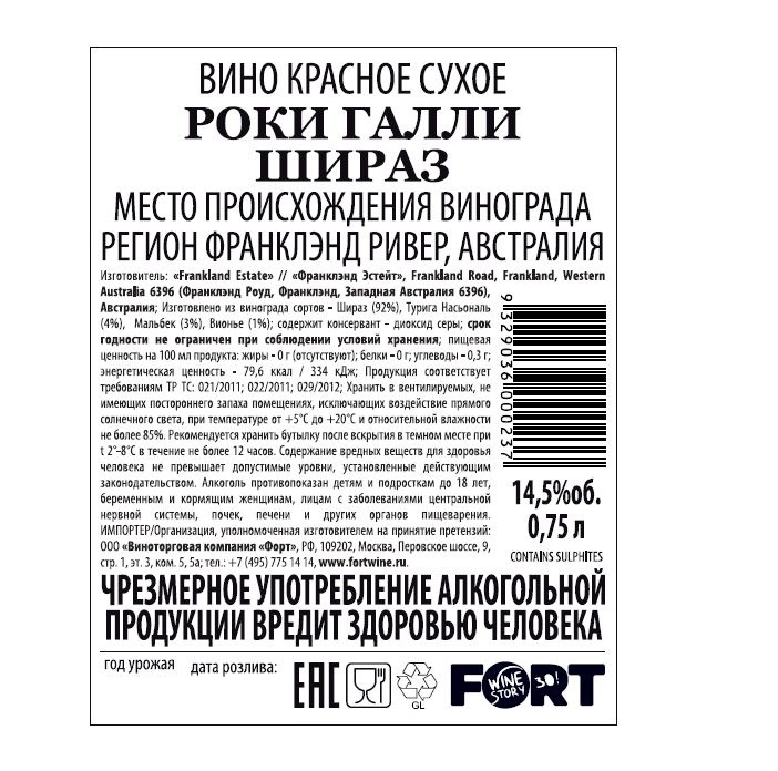 Шираз (92%), Турига Насьональ (4%), Мальбек (3%), Вионье (1%).